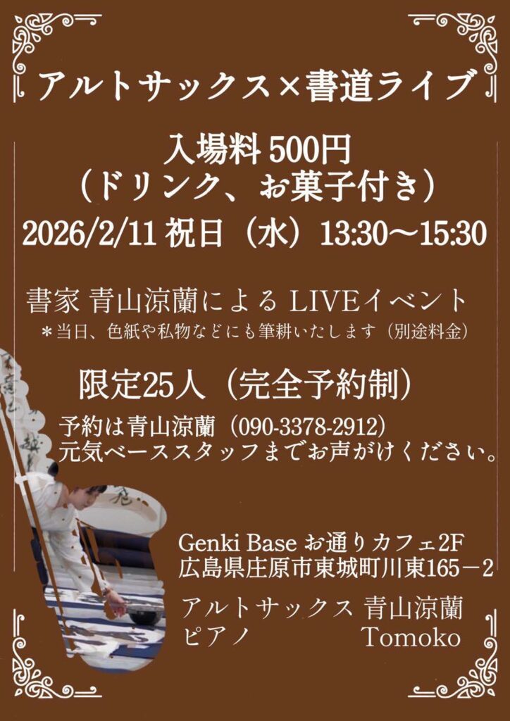 ■日時:2026/2/11(水) 13:30-15:30 書家 青山涼蘭によるLIVEイベントです。限定25人(完全予約制)です。 予約は青山涼蘭もしくはGENKI BASEスタッフまでお声がけ下さい♪