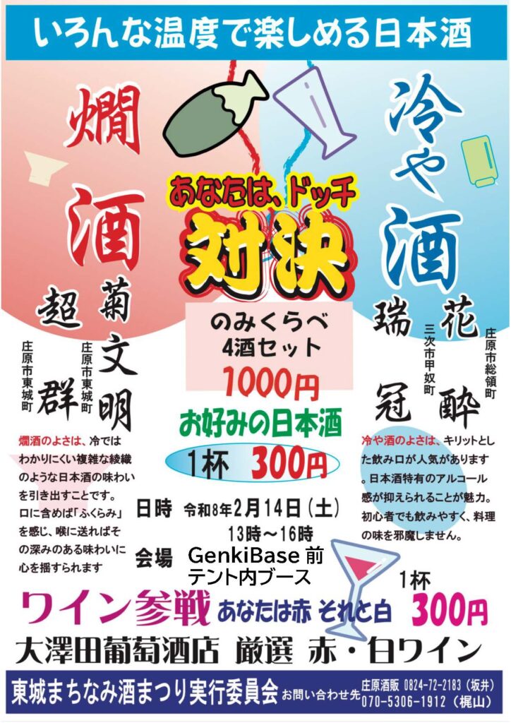 ■日時:2025年11月3日-6日 11時-16時 ※元気ベース&瀬尾医院駐車場がサブ会場になりました!※東城及び近隣の7酒蔵が呑めます※前売り券お通りカフェにて販売中 是非、お越しください♪